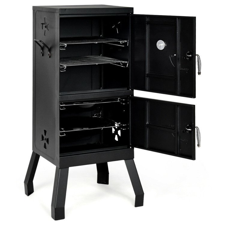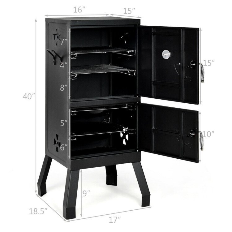 ● Intuitively Temperature Regulation: There's an easy-to-read thermometer on the door that can help you monitor the internal temperature during the barbecue process. Meanwhile, both sides of the charcoal smoker have four vents and you can adjust the firepower and control the smoking effect by opening or closing the vents.