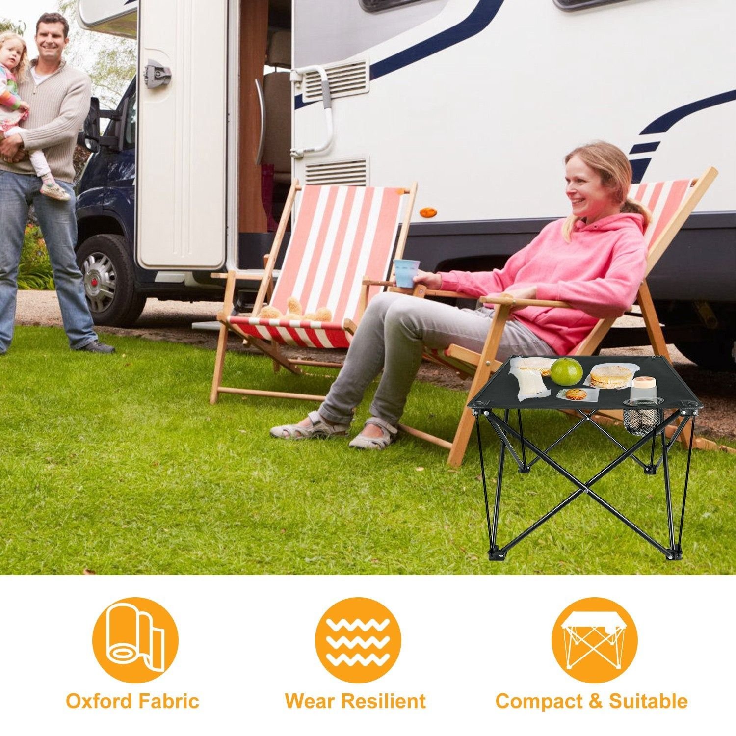 Crafted from 600D Oxford fabric, the tabletop is abrasion-resistant, tear-proof, and coated with a waterproof backing to resist spills and stains. Its X-shaped steel frame with anti-rust spray ensures exceptional stability and supports up to 44 lbs of weight—perfect for meals, drinks, or gear.