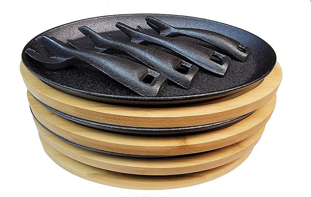 HAWOK Cast Iron Fajita pan with Bamboo Tray and Handle Set of 4