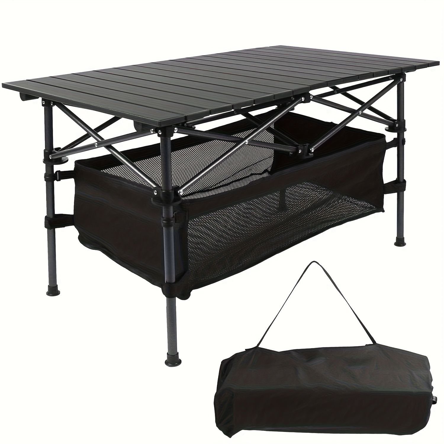 Lightweight and Portable Design: This camping table is made of lightweight aluminum, allowing for effortless transportation. It folds up neatly and comes with an easy-carrying bag, making it perfect for various outdoor activities such as camping, backyard BBQs, beach outings, and picnics. You can take it anywhere without adding much burden. For example, it's a breeze to carry it on a hiking trip or to a campsite by the river.Versatile Usage: Whether you're hosting a party on your patio, enjoying a picnic in the park, or having a barbecue in your backyard, this folding table is your reliable companion. It's also suitable for indoor use, providing an extra surface for your needs. Imagine using it to set up your snacks during a movie night at home or as a workspace in your study.Sturdy and Durable Construction: Crafted from high-quality aluminum, this roll-up table is built to last. It can withstand the rigors of outdoor environments and frequent use. The stable structure ensures that it won't wobble or collapse, giving you a secure surface for placing your items. Even when exposed to different weather conditions, it maintains its integrity.Medium Size for Convenience: The medium-sized design of this table offers just the right amount of space for your essentials. It's large enough to hold your food, drinks, and utensils during a picnic, yet compact enough to fit easily in your car or storage area. You'll find it to be the ideal size for both small and medium-sized gatherings.Easy to Set Up and Fold: Setting up and folding this table is a breeze. With its simple and intuitive design, you can have it ready for use in no time. When it's time to pack up, it folds quickly and fits snugly into the carrying bag. Say goodbye to complicated assembly processes and hello to hassle-free convenience.